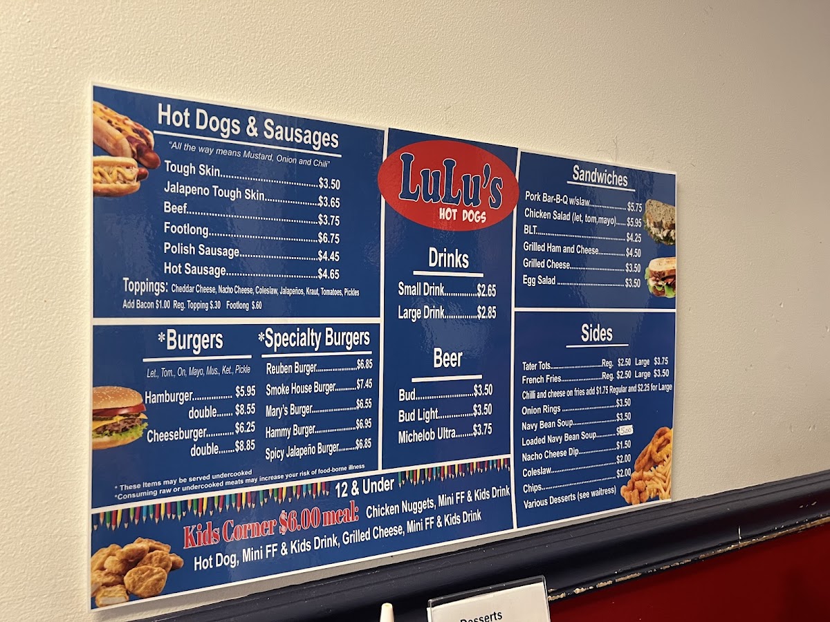 Me and my travels back home to my hometown all the years that I've been in area I never knew that Lulu's was there show me the message decide to stop off and check a hot dog stand out Google pleasantly surprised that the hot dogs were extremely tasty the french fries with fresh and just overall atmosphere was really awesome we was greeted at the door and the whole time that we was there all three servers was extremely attentive to us also a few patrons as well we had opportunity to sit and talk and reminisce about old times and enjoy some really really good food we was looking for some hot dogs and we found it I would definitely recommend this place I would definitely recommend if not only for the food but also for the patrons who's there and and the people who own it excellent job guys keep up the excellent work and we will definitely be back through!
